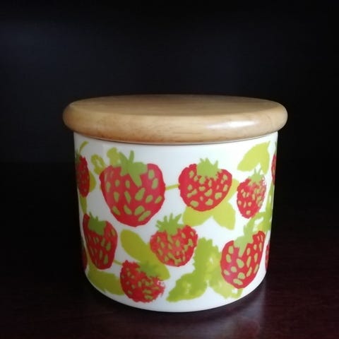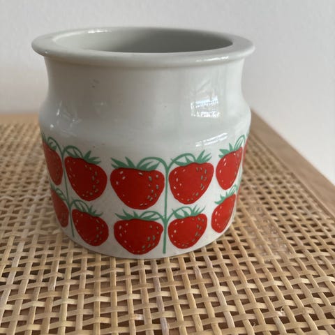 Kuvanmukainen Arabian Mantelia purkki. Huomioi kuvassa 3. näkyvä virhe ja lasitteen "halkeillut kunto".