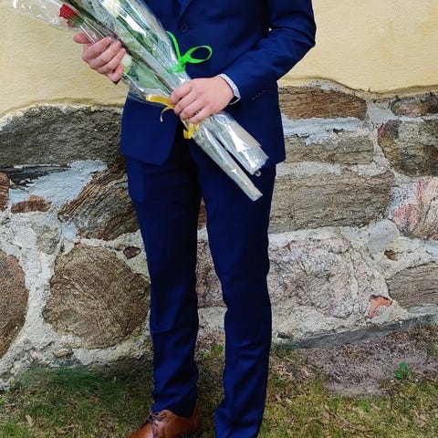 Puvuntakki on tummansininen, koko 48 ja slim fit.