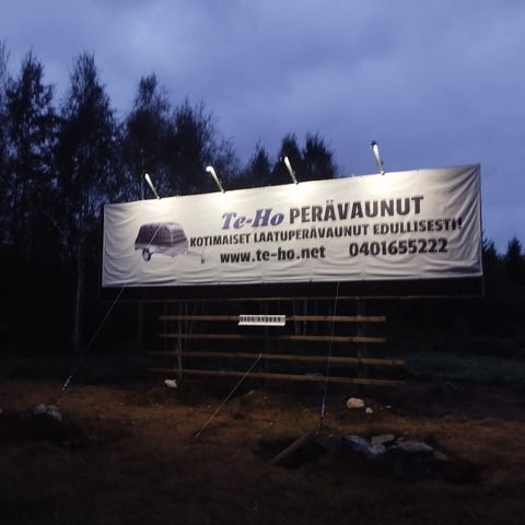 Mainoslakanalle tukeva teline. Tukevilla rautapalkkijaloilla, kestää hyvin tuulessa. Putket saa purettua erilleen kuljetusta varten. Mainoslakana paikan mitat noin 5x3m. Ostaja purkaa ja lastaa itse.
