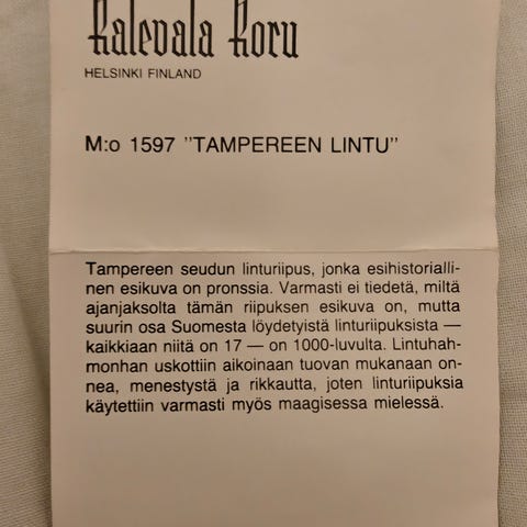 Kalevala korun hopeinen Tampereen lintu rintakoru, isompi koko 5 x 2,9 cm. Hieno kunto, neula suora, leimat, X7 = 1975.