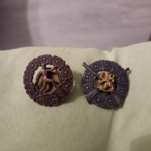 Kivääriammunnan sotilasmerkki, hopeanvärinen ruuvimerkki. Ilmeisesti ansiomerkki. Nouto tai postitus