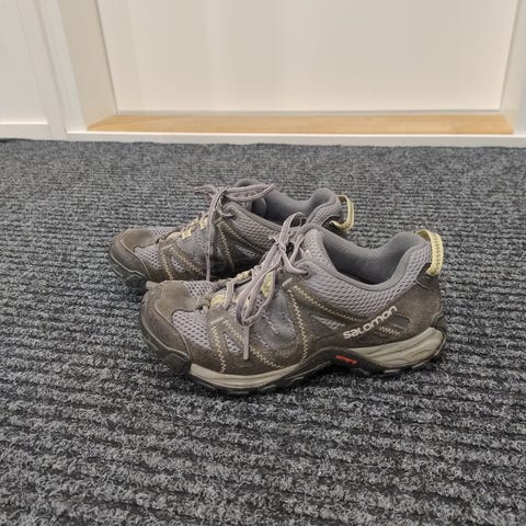 Myydään Salomonin Alphacross juoksulenkkarit kokoa 36. Sisäsyrjän kangas nilkkaosasta auennut reunasta molemmissa kengissä (kuva 2) mutta muuten ehjät kengät.