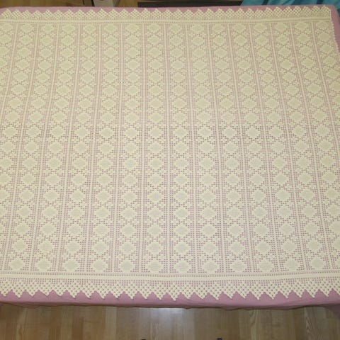 Suuritöinen luonnonvalkoisesta kalastajalangasta virkattu 3105g painava päiväpeitto Hllolan kuntakeskuksessa.
