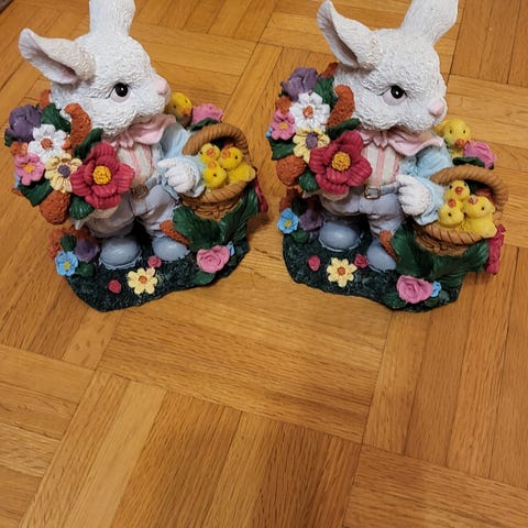 Myydään uudet ihanat pupu figuurit 3kpl yhteishintaan. Koot n. 12cm korkeita. Mitä olisi pääsiäiskoristelu ilman pupuja? Samettisen hohtavan turkkinsa ja mustan nenänsä ansiosta söpöt kaverit tekevät pääsiäisestä todellisen juhlan! Lyön vetoa, että löydät koristepupuille käyttöä joka vuosi pääsiäiskoristeluissasi! Savuttomasta kodista. Postikulut 9euroa. Yhdistelen postikuluja.