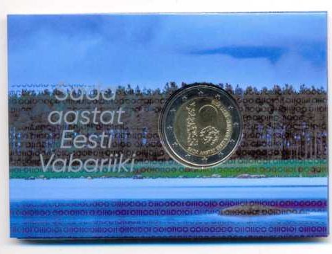 Kuvaus ulkoasusta : Kolikon kuva-aiheessa on samanaikaisesti numerot 18 ja 100. Ne symboloivat Viron itsenäistymisen ajankohtaa ja kuluneita sataa vuotta. Alhaalla oikealla on teksti SADA AASTAT EESTI VABARIIKI ja sen vieressä maan nimi EESTI ja liikkeeseenlaskuvuosi 2018.