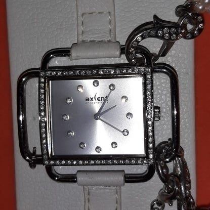Ehkä nyt raaskin luopua tästä upeudesta, kun en rannekelloja enää pahemmin käytä. Täydellinen unelma kenkien fanille. Pinkki glitterinen Axcent rannekello, jossa erilaisia koristeita, joita voi sommitella mielensä mukaan. Helmiketjun lukosta yksi kivi irti ja glam laatan lukko ei ihan riitä kiinni asti, mutta pysyy kellossa hyvin siitä huolimatta, kun nuo kiinnityskohdat sen verran paksuja, niin ei pääse luiskahtamaan irti käytössä, glitter myös aavistuksen kulunut pois, ei muuta moittimista. Mukaan oma samettimainen rasia, jonka pohjassa rasian liimaukset näkyvät läpi.