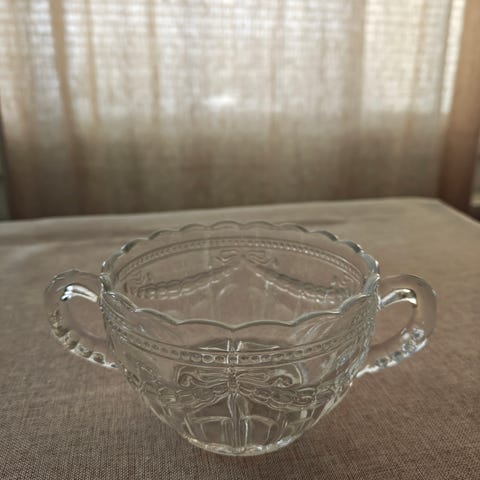 kirkasta,kuvioitua lasia. Sokerikon halk.10cm,kork.6,5cm. Kermakon halk.9,5cm,kork.8cm. Vain vähän käytetyt.