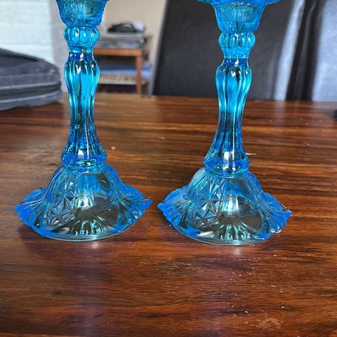 Ranskalaisen Reims-lasitehtaan neljä kynttilänjalkaa. Kynttilänjalat ovat kirkasta lasia. Yhden jalan korkeus on 5,5 cm ja yläosan läpimitta 7,5 cm.