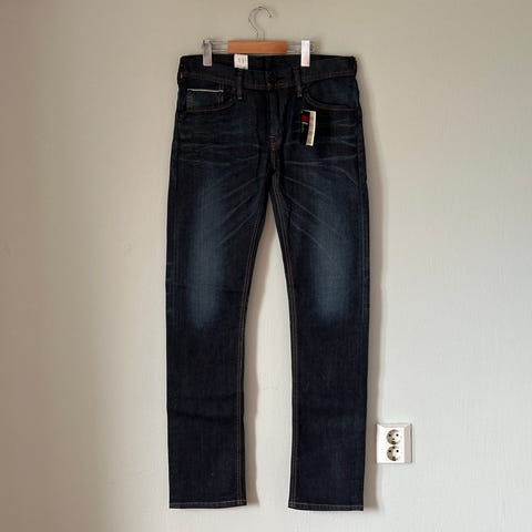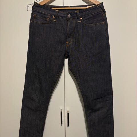 Slim straight Strike Gold denim with the signature gold selvage id. The denim is very very nice, with quite uneven texture.