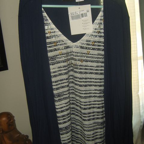 käyttämätön laadukas ja tyylikäs saksalainen Steilmann jakku. Kankaan kuosi murretunsini-valkoraidallinen. Raidan sininen väri on hiukan harmahtava. Tehosteena tikkauksia ja tummansinisiä ja valkoisia kanttauksia. Kankaan kuosi tulee parhaiten esiin pikkukuvasssa. Materiaali laadukas ja ryhdikäs 97 % puuvilla, 3 % elastan. Napilla suljettavat taskut, hihansuissa halkiot. Hihat voi pitää suorana tai taitettuna ylös. Koko 48.