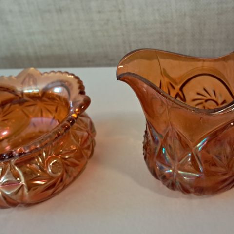 Riihimäen lasi oy . Lysterilasi sokerikko ja kermakko. Tuotteet ovet hyvässä kunnossa. Sokeriko korkeus noin 4 cm . ja halkaisija noin 9,5 cm. Kermakon korkeus noin 5 cm ja halkaisija noin 8 cm.