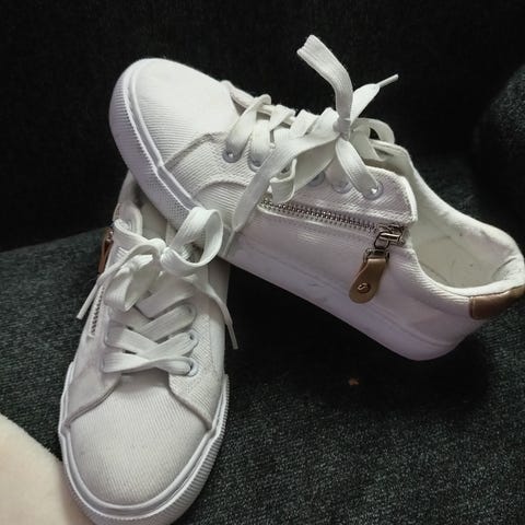 Uudet, käyttämättömät kangastennarit, nauhat mukana. Ulkosyrjällä niittejä.