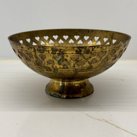 Vanha messinkinen astia, korkeus 10 cm, halkaisija 10 cm. sisällä "metallihometta"