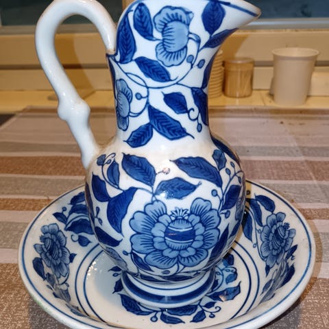 Posliiniset pesukannu ja vati koristeeksi.