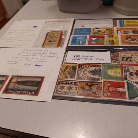 Parituhatta erilaista tulitikkuetikettiä vihkoihin liimattuna ja irrallisina. 50-luvulta pääosin. Kymmeniltä eri pailkakunnilta etikettejä, kysy lisätietoa. Alkaen 20 snt kpl. On mm. urheilu -, sotilas -, olut -, auto -, traktori -, kahvi -, tee -, jäätelö -, mauste -, jauho -, pankki -, vakuutusyhtiö -, partio -, elokuva -, tupakka -, meijeri -, ravintola -aiheisia. Postikulut lisätään.