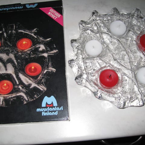 Lasinen tuikkulyhty, jonka korkeus noin 7cm ja halkaisija noin 12cm. Muurla, design Simo Tavast.