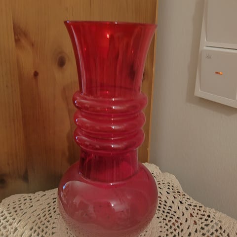 Amber -värinen maljakko, jonka korkeus noin 20cm ja suuaukon halkaisija noin 9,5cm. Riihimäen Lasi, design Tamara Aladin.