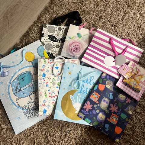 Viisi (5 kpl) kaunista lahjapussia, säilytyspussia. Kolme isointa on Kiinasta, silkkiä, koko 37 x 26 cm. Ruusukuvioinen 20 x 15 cm ja pienin valkoinen 13 x 9 cm. Ehjät ja siistit. Hinta on kaikille yhteensä.