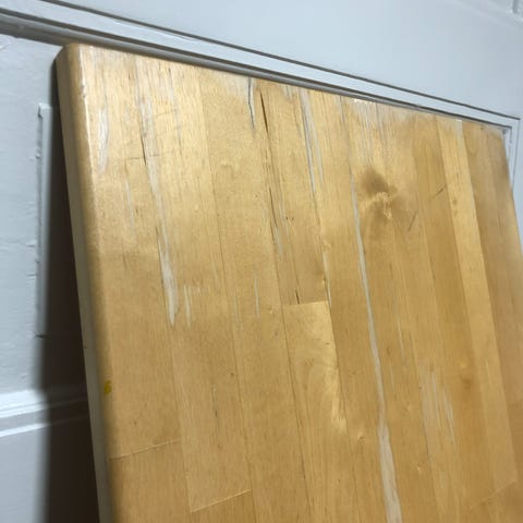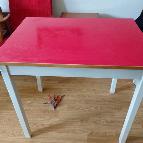 Pöytä/taso, jalat metallia, renkaat. Leveys 75 cm, syvyys 30,5 cm, korkeus 37,5 cm.