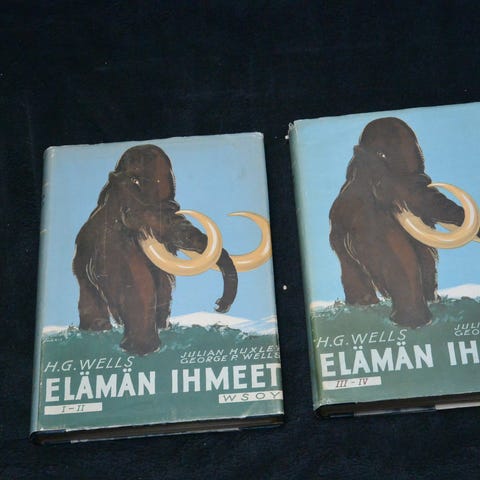 H.G. Wells / Julian Huxley / G.Ph. Wells : Elämän ihmeet , 6. painos 1954, WSOY, kovakantinen. Kansissa ja selkämyksessä kulumaa etenkin selkämyksen nimikkeessa, kansissa kellastumaa. Muutamassa sivussa kosteuslaineilua, sivujen syrjissä joitakin tahroja, sivuissa kevyttä kellastumaa.