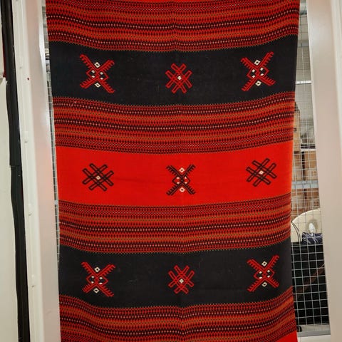 Ruskean-/oranssinävyinen seinävaate tai raanu.