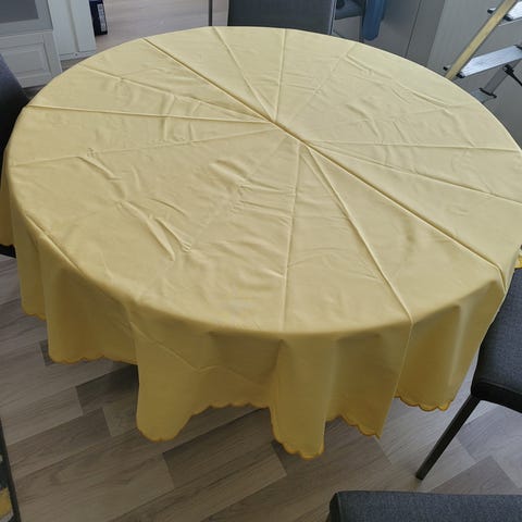 Puna/keltakuvioinen pöytäliina, puvillaa, konepesun kestävä 40-60 astetta, reunat kantattu. Nouto tai postitus
