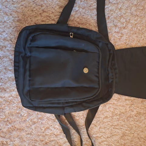 Beagles-merkkinen reppu. Sisällä vetoketjutasku. Nahkanyörit ja -somisteet. Huom. edessä olevasta taskusta puuttuu toinen kiinnitysneppari (ks. kuva).