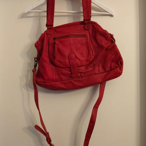 Siirryin muutama vuosi sitten reppuihin ja nyt kaapeista löytyy myös aarteita. Tämä punainen paksua pintanahkaa oleva olkalaukku voisi hyvin olla jonkun loppuelämän laukku. On huippulaatuinen yksilö. En juuri ehtinyt edes pitää tätä ja siksi sitä voi sanoa uudenveroiseksi.