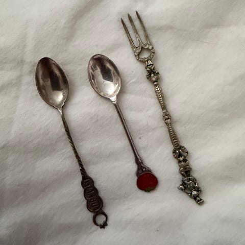 - lusikat, veitset, hopealaatat (toinen puuttuu kuvista!), sininen mitallirasiassa,