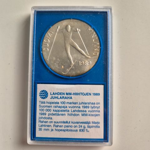 Lahden hiihdon 1978 maailmanmestaruuskipailujen hopeinen juhlaraha. Paino 26.3 g, läpimitta 37 mm.