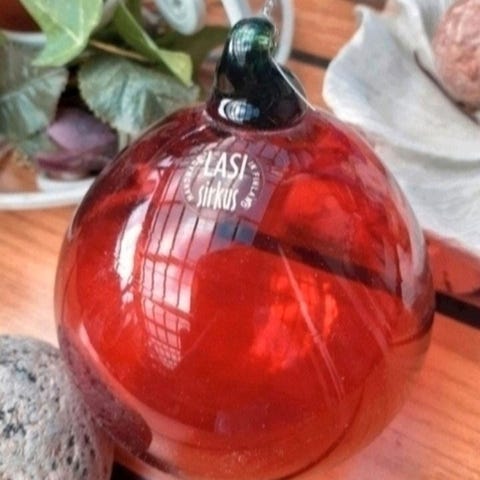 Suupuhallettu taidekäsityönä tehty Lasisirkuksen punainen lasikoriste.
