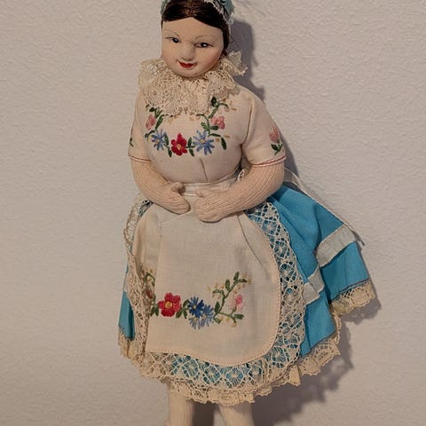Vanha mutta virheetön puusta sorvattu ja käsin maalattu kansallispukuinen nukke, design Kokeshi Hawaii, korkeus 18 cm, ehjä