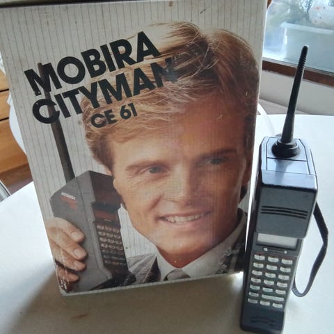 Mobira Cityman 300 NMT-puhelin, toimiva, laturi, autoteline, autolaturi, pidikkeet.