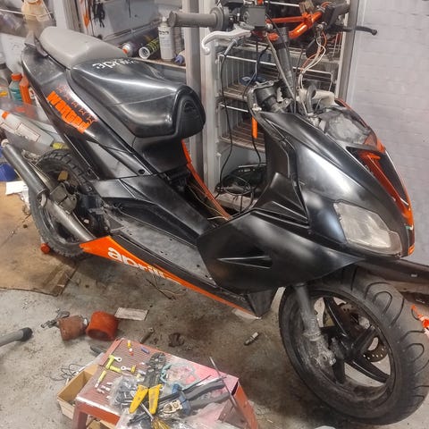 Aprilia skootterin alkup. sylinteri ja mäntä. Ollut mallissa Aprilia SR 50 R. Sen verran väljä ettei käynnisty tällä kombolla. Eli on hommattava ainakin uusi mäntä tai porauttaa ja hommata ylikoon mäntä. Asiaan kuuluvia tiivisteitä mukaan.