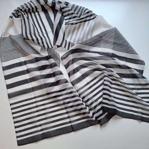 Huivi, 33 cm x 156, materiaali todella hienoa, samettisia kuvioita läpikuultavalla pohjalla. väri musta, mutta taittuu hienosti harmsan sävyihin.