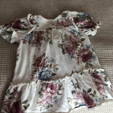 Itse ommeltu kukkamekko koko 62cm. Takana neppari halkio niskassa, helpompi pukea. Kankaan värit säilyneet hyvin.