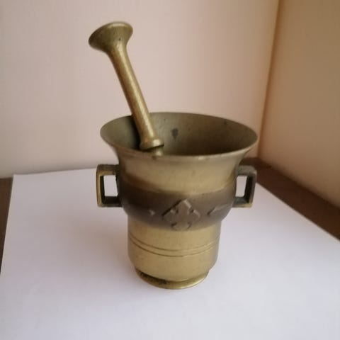 Myydään antiiki messinki mortteli. Korkeus 9 cm.