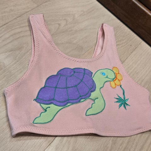 Villervallan uimapuku 98/104 pari kertaa pidetty eli erittäin hyvä kunto. Ainoa huomauttamisen aihe on se, että haaraosassa parin sentin matkalta ommeltu siististi käsin sauman reuna paremmin kiinni, ks kuva jossa mittanauha merkkinä.
