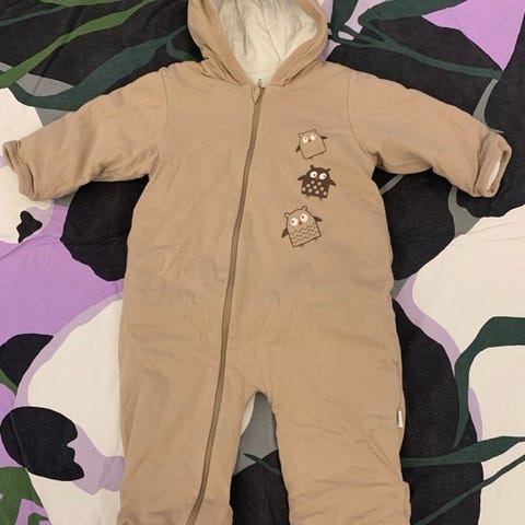 Miellyttävä vanupuku kylmeneviin ilmoihin. Koko 68-74. Käännettävät lahkeet ja hihat. Hupussa korvat. Sopiva alle 1-vuotiaille. Ei haittaa vaikka olisi vauvalle hieman isokin.