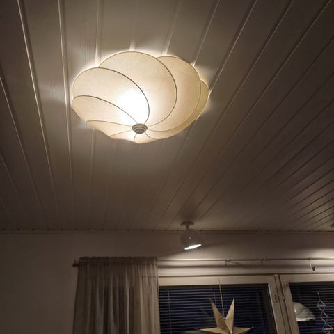 Kattoon laitettava varjostin,kork.on 28 ja lev.21,5 johdon päästä puuttuu se kiinnitys osa varmaan joku sokeripala mihin johto tulee kiinnittää.Tiedustelut :s-postilla