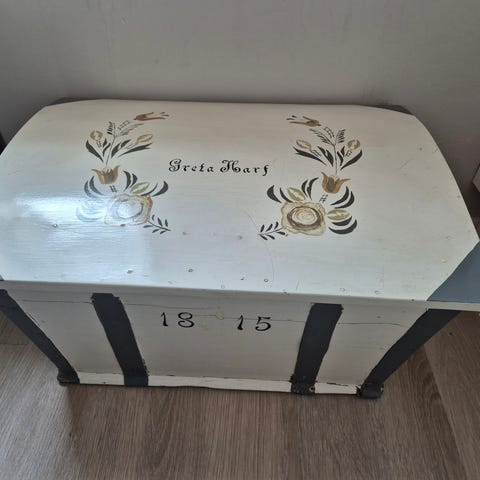 Vanha matka-arkku. Ajan tuomaa kulumaa. Edelleen tukeva. Ei ylimääräisiä hajuja. Leveys 92cm, syvyys 55cm, korkeus 35cm. Nouto Sulva.