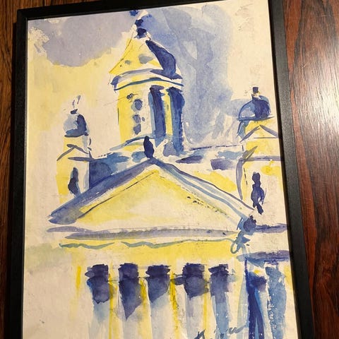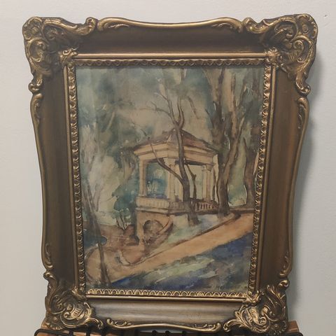 T. Vainion Järvimaisema. Lasikehys. Taulun korkeus 33 cm ja leveys 35 cm.