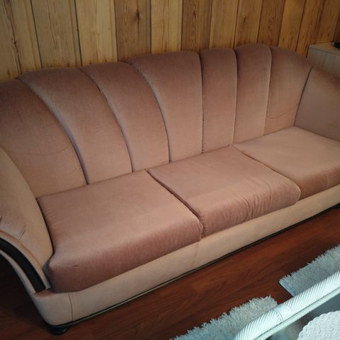 Sohva, täyspuuta ja nahkaa.