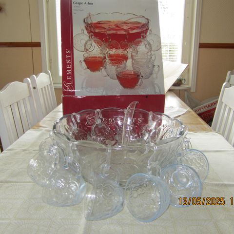 Kesän juhliin ja illanistujaisiin iso boolikulho jonka vet.n.4litraa, 12 mukia josta 1 sanka rikki. Yhden mukin vet.n.2dl, kovamuovinen kauha.