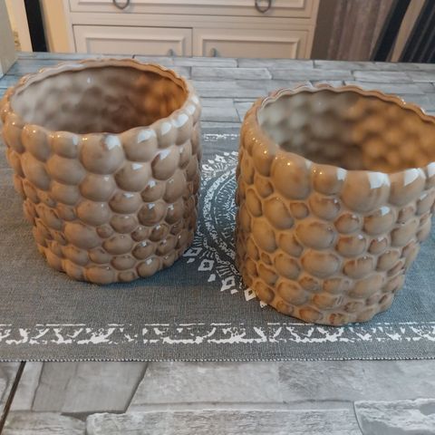 Kolme pientä lasista suojaruukkua. Yhdestä lautanen mennyt rikki. Ruukuissa ei reikää pohjassa.