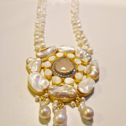 Aitoa nahkaa ja nahkanaru noin 96 cm pitkä. Kristalli - helmi asetelma noin 55 mm halkaisija.