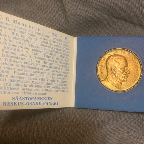 C.G.E Mannerheim . Mitali muovikotelossa.Ratsutaistelija 1887-1917.Candida Candido Pro Ense Causa lukee mitalissa "puhtain asein puhtaan asian puolesta"Kultaus 24 karaattia.Kuparinikkeliä. Halkaisija 38,6 mm . Paino 26 g.Rahapaja valmistanut Mannerheimin syntymästä 150 vuotta kunniaksi.