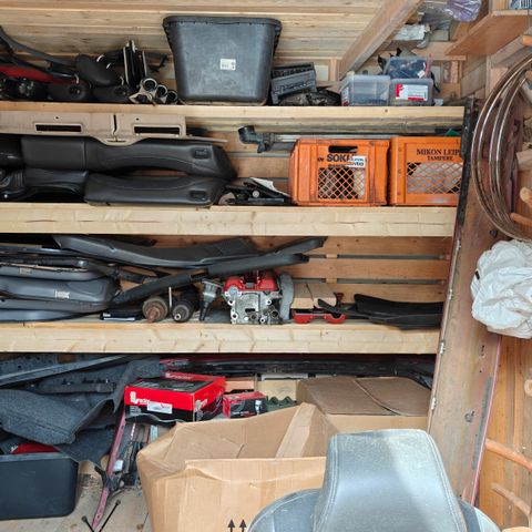 Viisi ovisen sivuikkunoita. etu ja takavalot, peilit. ilmamassa mittari, etu ja taka-akselin osat, mittariston osia, vetokoukku ym.