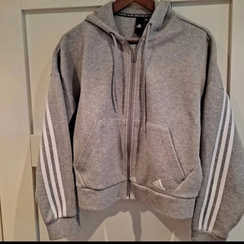 Selässä keskellä kolme raitaa, vasemmassa kyljessä lukee Adidas, oikeassa rinnassa logo. Taskut.