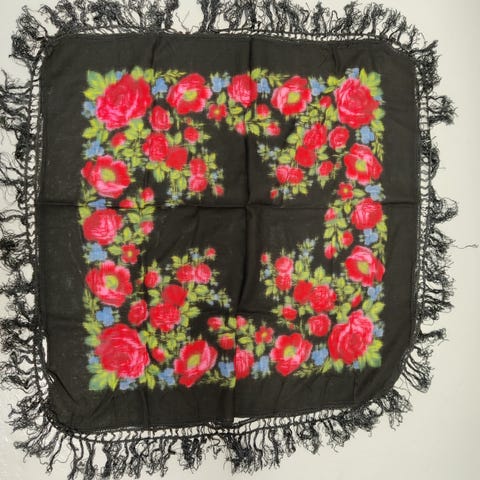 Maatuskahuivi, villahuivi, huivi, ruusuhuivi, hartiahuivi, kukkaishuivi, venäläishuivi, vintage